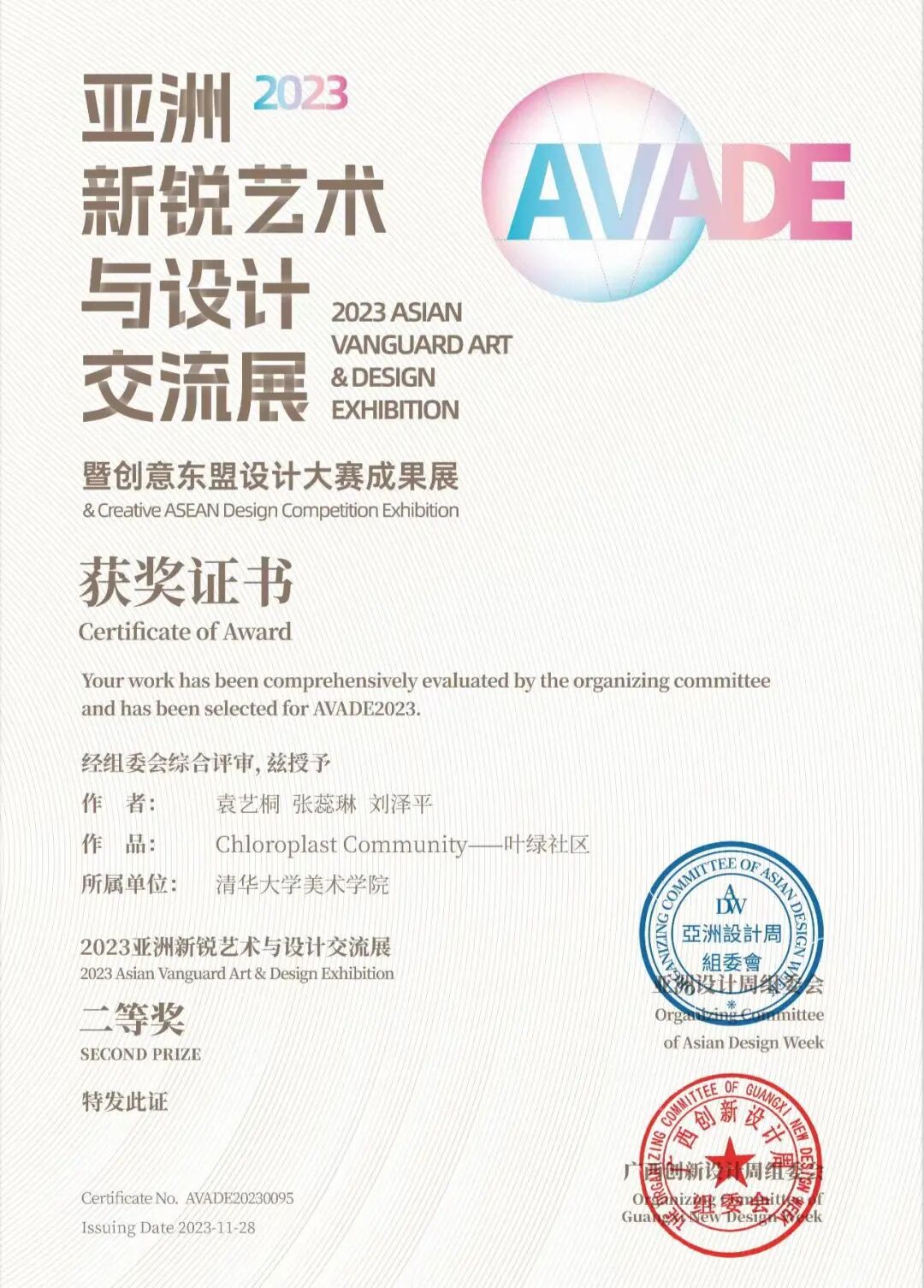 此次交流展,共计收到了全球16个国家近百所院校1500余件的投稿。清华大学美术学院学生查星宇的作品《计算思维下的奥林匹克形象展示景观设计》获得一等奖;袁艺桐、张蕊琳、刘泽平三位同学的作品《Chloroplast Community——叶绿社区》获得二等奖。清华大学美术学院获得组委会颁发的“最佳组织奖”,同时获奖的还有澳门科技大学、马来亚大学、中国美术学院、中欧国际设计文化协会、世界绿色设计组织绿色设计研究院、北京设计学会、英国皇家艺术学院等团队。
