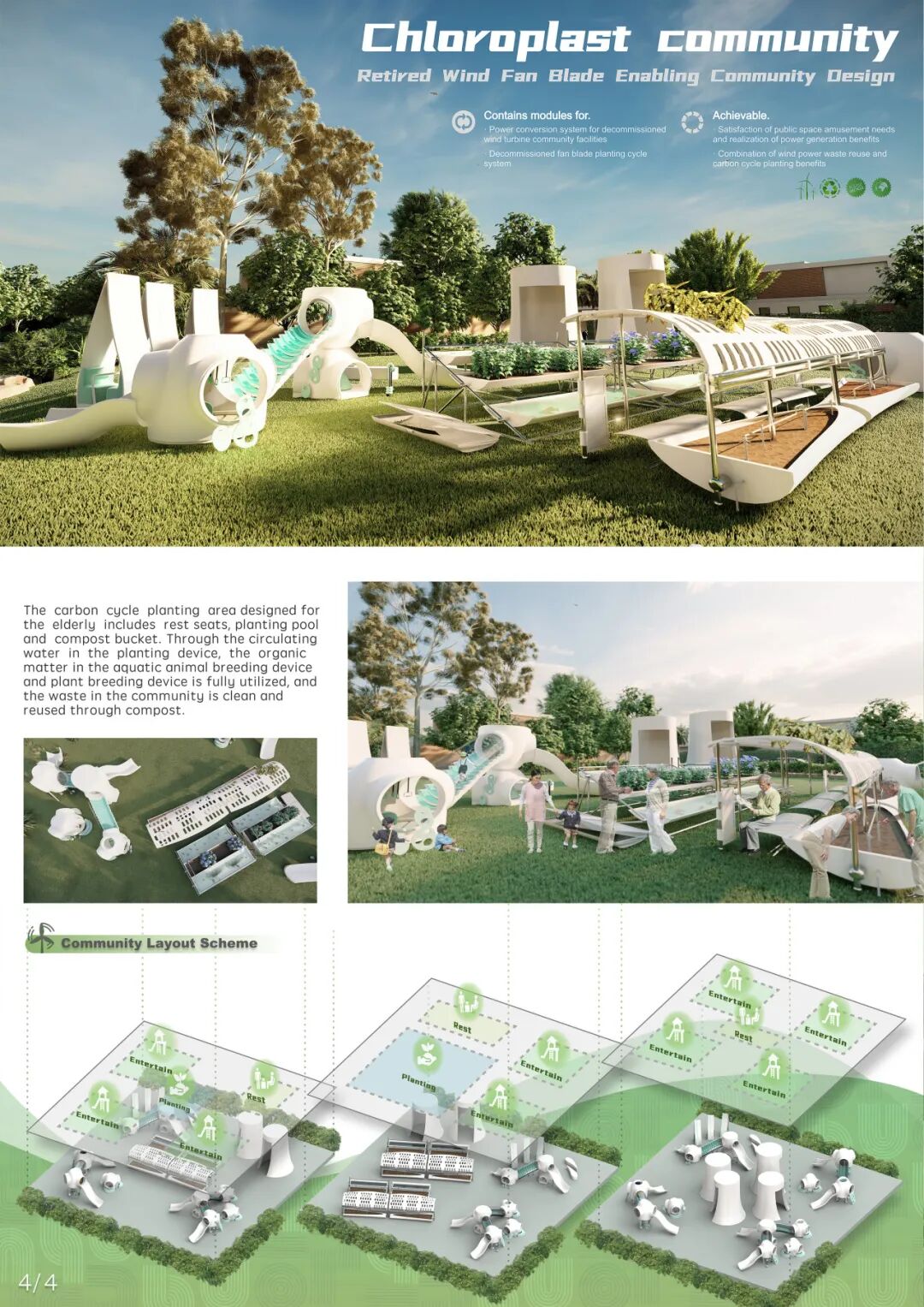 本作品将AEOLON1.5MW退役风电扇叶以及轮毂切割后,巧妙设计成一个低碳循环的娱乐休闲社区。具体包括运动发电模块装置、动植物养殖循环装置与外棚、休憩宣传区、堆肥桶系列设计。利用风电扇叶中较宽大的区域搭建棚顶作为种植区与活动区;中等大小的区域利用其中空结构,作为动植物碳循环养殖装置;将风力发电轮毂上下组合,设计成面向成人的运动发电设施的椭圆机、跑步机装置,以及面向低龄儿童的发电踩踏楼梯、拉杆、摇杆、攀爬架等娱乐装置。